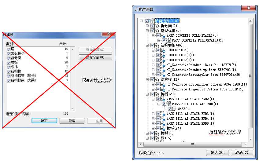 增强的图元过滤器,支持类别、族、类型等三级分类,完全解决了Revit只能按类别过滤的局限。