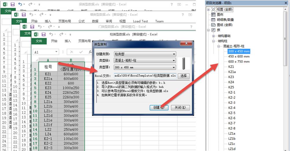 通过导入外部的定义Revit类型的数据,快速创建Revit的族类型。目前支持墙、门、窗、梁、柱、板等类型。