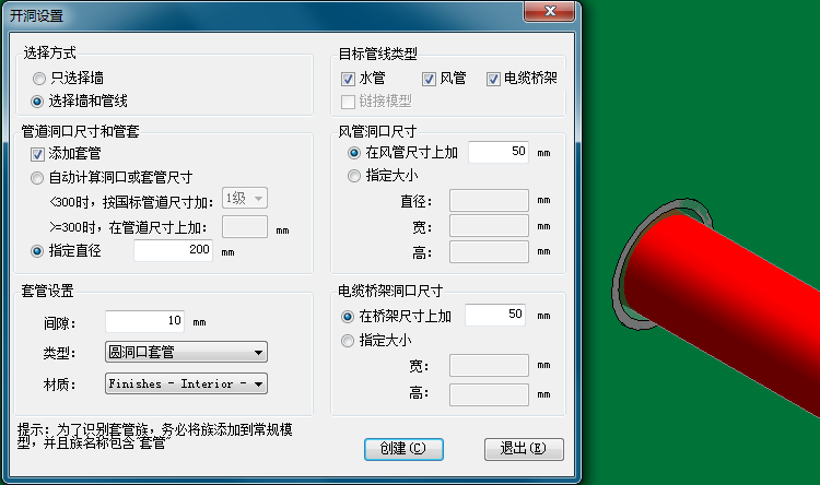 能够根据墙、板与管线的管线进行墙体的智能、自动开洞,开洞支持增加套管等相关设置;开洞以后墙与管线的移动后洞口能够自动更新。