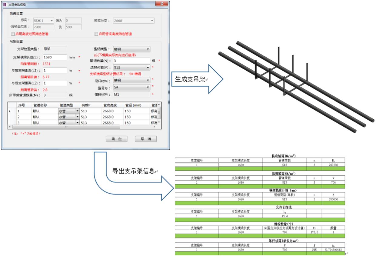 计算支架可以在单根或多根管道上进行型钢、槽钢支架的快速放置,放置后可以自动计算管道荷载、抗弯强度、数量等。